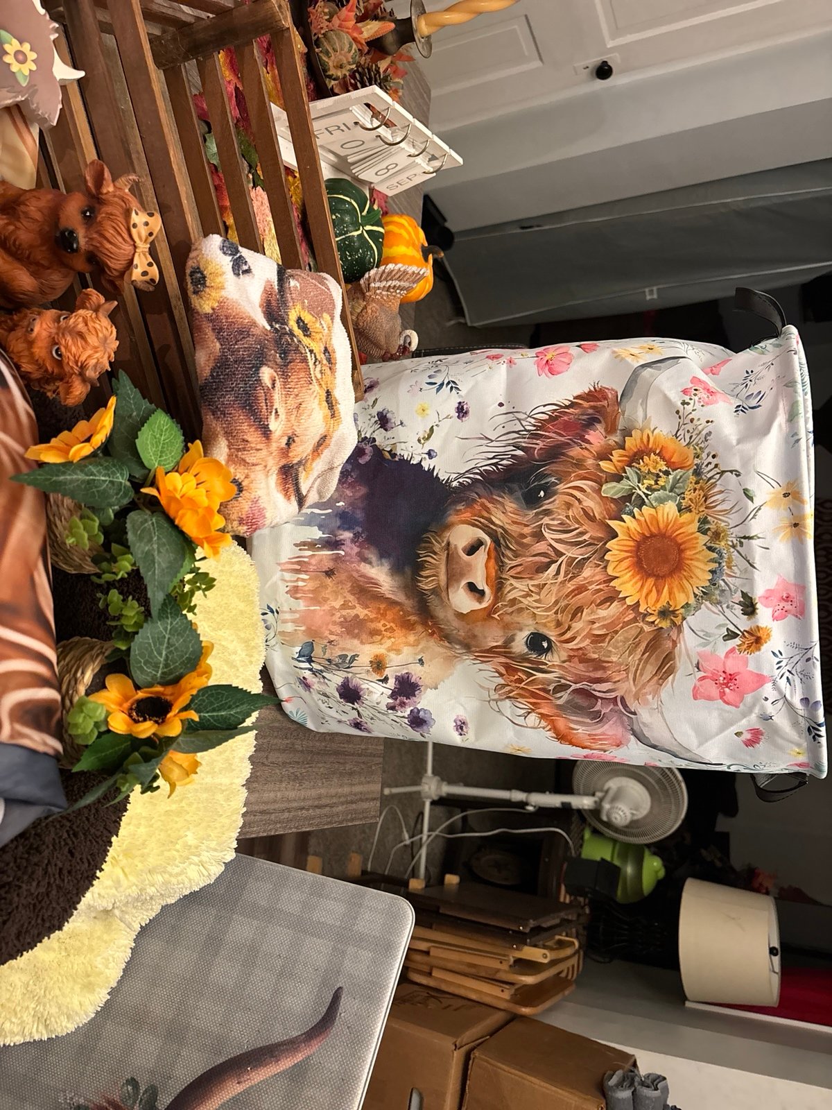 Highland cow bathroom decoration lot includes Highland cow bathmat, brown, and yellow baths, yellow one does have a little staining as seen in photo. Pop up laundry hamper, brown decorative crate, three Highland cow figurines, wooden Highland cow statue, four piece highland cow wall hangings, Highland cow Clock that works, to wicker and sunflower decorative plants, Highland cow shower curtain. Just redecorating my bathroom. Willing to bundle and accept offers on most items.